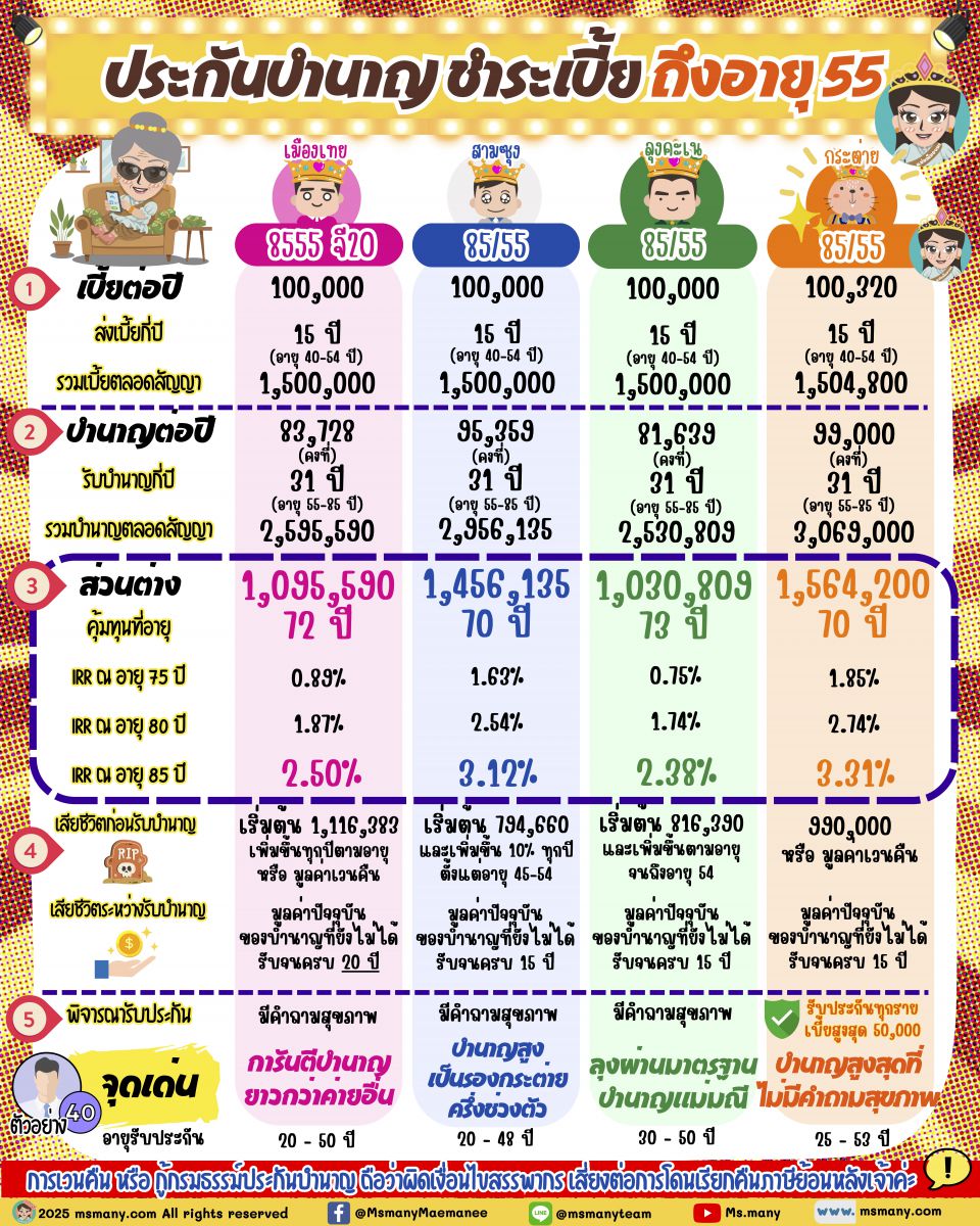 กลุ่มที่ 4 บำนาญชำระเบี้ยถึงอายุ 55 กลุ่มนี้เป็นประกันบำนาญที่แม่มณีโปรดปรานที่สุดเจ้าค่ะ แม่รู้สึกว่ามันคือวินัยการออมที่ยาวนานเพียงพอ แต่ก็ไม่ต้องรอนานได้เงินบำนาญตั้งแต่อายุ 55 ปี เรี่ยวแรงยังมีพอสำหรับการใช้เงิน ได้บำนาญเร็วทันใช้ และเป็นกลุ่มที่ได้บำนาญสูง คืนทุนไวทั้งกระต่าย และ สามซุงคืนทุนตั้งแต่อายุ 70 ปี ใช้ระยะเวลาการเก็บเงินในวัยทำงานนานพอสมควร จึงได้บำนาญก้อนใหญ่ นอกจากนั้นกลุ่มบำนาญส่งถึงอายุ 55 ปี ยังเป็นกลุ่มที่มีทุนประกันชีวิตในช่วงระยะเริ่มต้นแบบเป็นจริงเป็นจัง คนข้างหลังไม่มองค้อนเหมือนประกันบำนาญระยะสั้น ถ้าเกิดแจ้คพอตแตกตายเร็วก่อนรับบำนาญขึ้นมาก็ยังมีมรดกให้คนข้างหลัง ปังสุดในหน้านี้แม่มณีมอบมงให้กระต่าย บำนาญต่อปีสูงสุด และยังมีเงื่อนไขพิเศษเอาใจคนมีปัญหาสุขภาพในช่วงปลายปีนี้ อนุมัติทุกกรณีมีโรคก็ทำได้ในวงเงินเบี้ยประกัน 50,000 ต่อราย แผนนี้จึงกลายเป็นทางเลือกที่ดีที่สุดที่แม่มณีแนะนำสำหรับคนที่มีปัญหาสุขภาพแต่อยากจะทำประกันบำนาญที่คุ้มค่า ได้ผลตอบแทนสูงลิ่วเท่าเทียมกับคนที่สุขภาพแข็งแรงเจ้าค่ะ