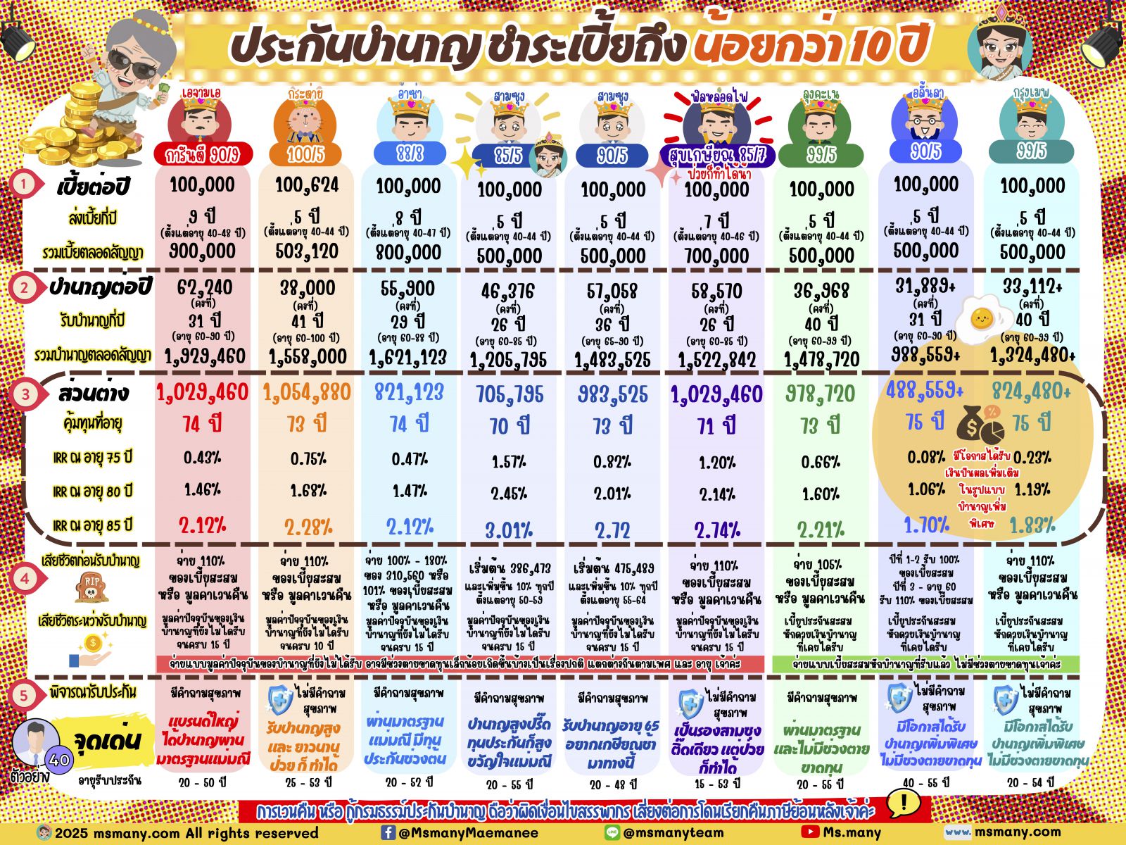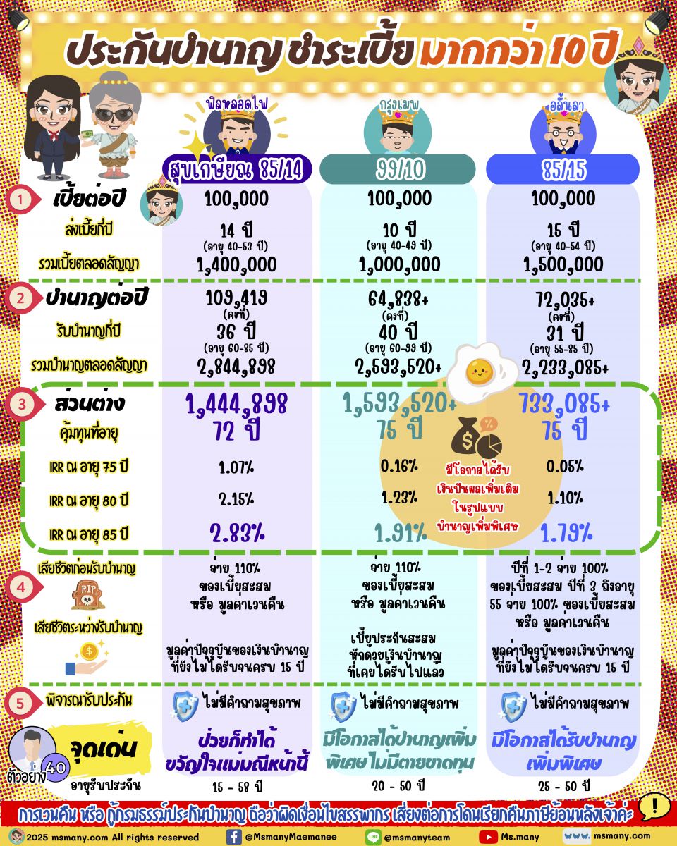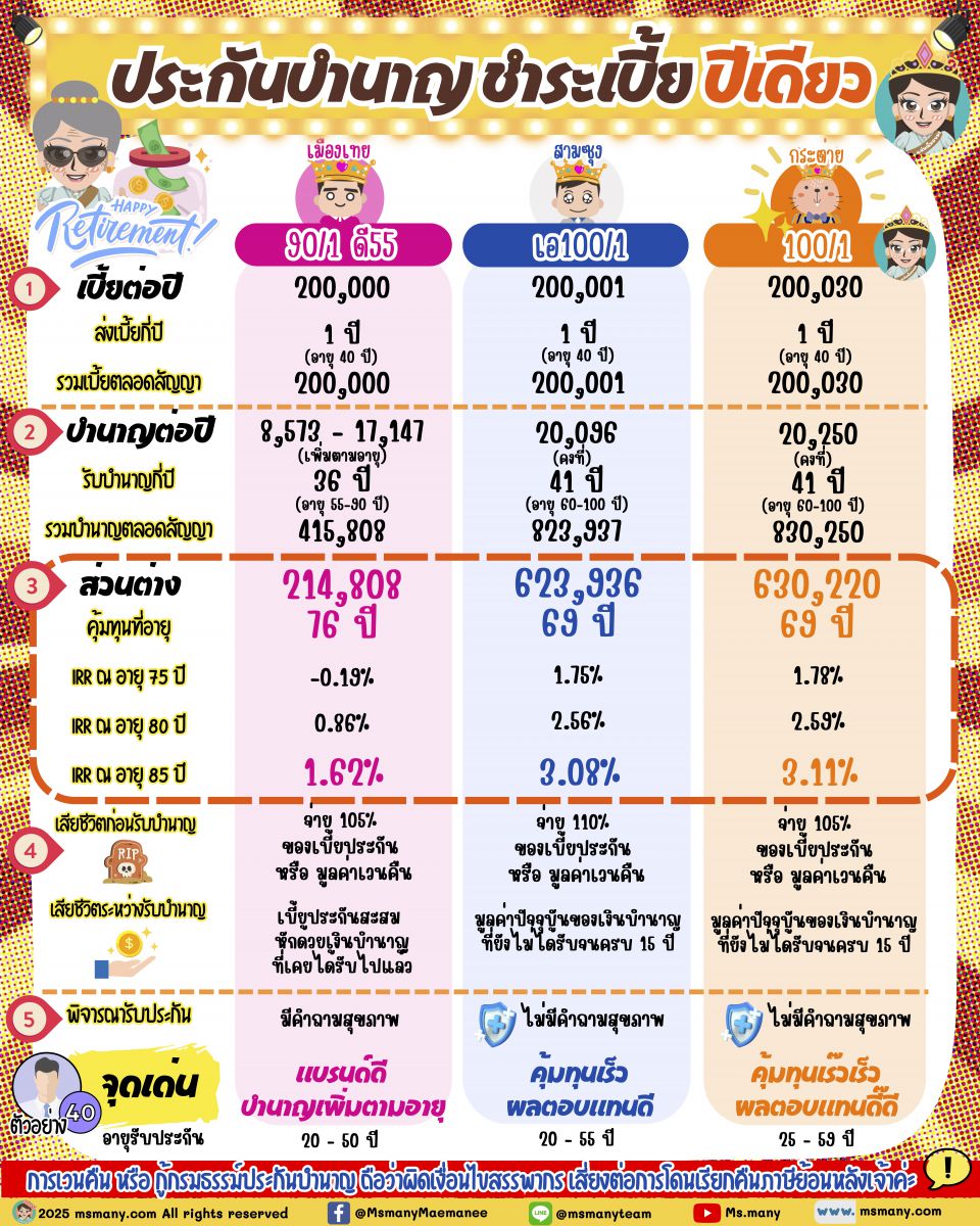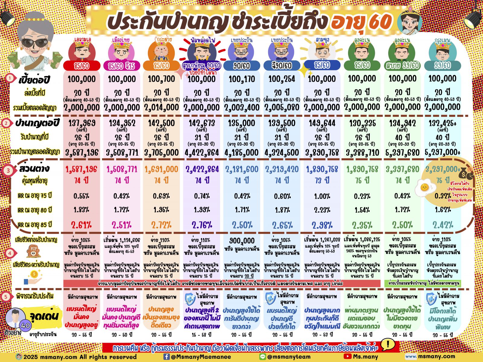 กลุ่มสุดท้าย สำหรับผู้สวนกระแสเกษียณไวในยุคนี้ อยากจะมีช่วงวัยทำงานยาวนานถึงอายุ 60 ปี ต้องลดหย่อนภาษีอยู่แล้ว บังคับตัวเองโยนเงินไปเก็บไว้ให้ตัวเองตอนแก่ยาวไปเลยดีกว่า ตระกูลนี้เรียกว่าแข่งกันดุเดือดที่สุด คุ้มทุนก่อนอายุ 75 กันสิบกว่าแผนมากหน้าหลายค่ายใหญ่เล็กมาเช็คชื่อกันครบถ้วน ซึ่งถ้าเป็นสไตล์แม่มณี ซื้อบำนาญแม่ก็เพ่งไปที่บำนาญก่อน ดังนั้นมงก็ไม่หลุดไปไหนสามซุงจัดไปเลยเจ้าค่ะ และถ้าจะพิจารณาในด้านอื่น ทุนประกันชีวิตเริ่มต้นก็สูงใช้ได้ การันตีบำนาญ 15 งวดตามมาตรฐานประกันบำนาญไทย อย่างไรก็ดีตัวนี้มีคำถามสุขภาพด้วยหนาเจ้าคะ สำหรับใครที่มีปัญหาสุขภาพและอยากทำหน้านี้ ฟิลหลอดไฟเจ้าเก่ามารอรับเรียบร้อย สุขเกษียณ 90/60 บำนาญน้อยกว่าเล็กน้อย กรณีเสียชีวิตก่อนรับบำนาญจ่ายเป็นเบี้ยสะสมบวกเพิ่มให้อีก 10% ดังนั้นไม่ต้องตอบคำถามสุขภาพเจ้าค่ะ จัดไปสำหรับใครที่มีปัญหาสุขภาพ ไม่แข็งแรง กระเสาะกระแสะแต่อายุยืน ฟิลหลอดไฟ บำนาญสูงอันดับสอง แต่รองรับผู้มีประวัติสุขภาพอย่างยินดียิ่ง