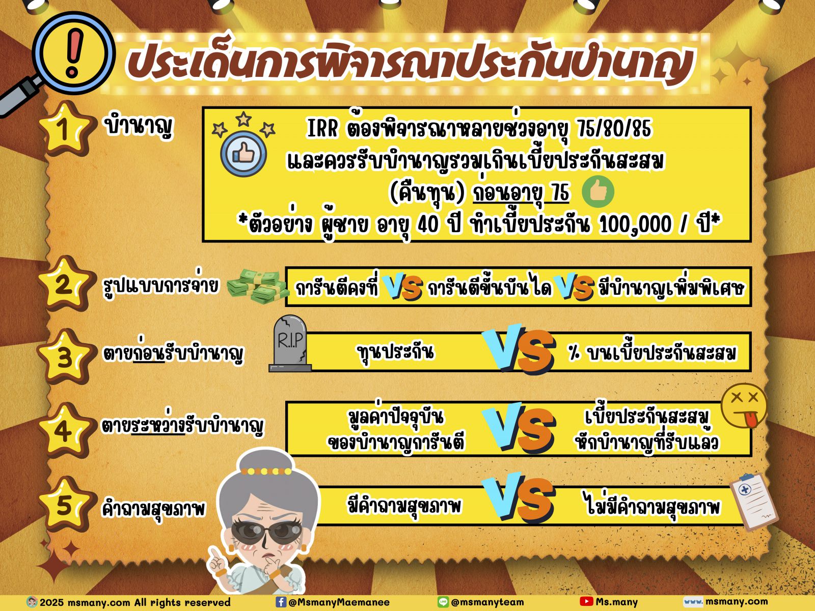 ประกันบำนาญชักจะมีลูกเล่นหลากหลาย สีสันจัดจ้านถึงใจ ก่อนจะไปดูแผนที่แม่มณีคัดมาให้ด้วยจริตแม่ จะขอเวลาหนึ่งหน้าในการอธิบายประเด็นที่ควรพิจารณาในการเลือกหาประกันบำนาญ ซึ่งมี 5 ประเด็นสำคัญ สำหรับใครที่มั่น ฉันรู้อยู่แล้วว่าเลือกยังไง ข้ามไปอ่านเปรียบเทียบหน้าสองได้เลยเจ้าค่ะ