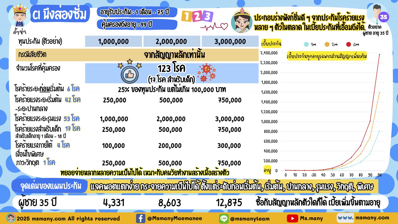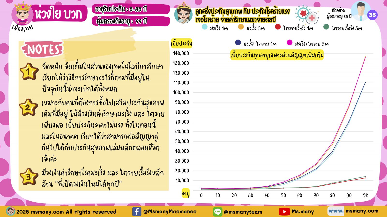 แต่ข้อจำกัดของกลุ่มนี้ คือเบี้ยประกันมันจ่ายทิ้ง และเพิ่มตามอายุเจ้าค่ะ วัยทำงานน่ะเบี้ยหลักพันต่อปี จ่ายไหว ไม่ยาก แต่ทำใจจ่ายลำบากหลังเกษียณ เพราะเบี้ยหลายหมื่น ยันหลายแสน (แตะล้านก็มี) ถึงแม้ในทางทฤษฎีจะต่อสัญญาได้ยาวกันสุดชีวา แต่ว่ายากที่จะมีใครจ่ายเบี้ยไหว อย่าลืมว่าเราก็ต้องเตรียมเงินไว้จ่ายเบี้ยประกันสุขภาพหลักแสนอยู่แล้ว ดังนั้นกลุ่มนี้เหมาะกับการประกันความเสี่ยงระยะสั้นระหว่างสร้างเนื้อสร้างตัว จ่ายเบี้ยไหวและยังกังวลใจความเสี่ยงโรคร้ายก็ทำกันไปเป็นปีต่อปี วันดีคืนดีเบี้ยเริ่มบานปลายจ่ายไม่ไหว หรือไม่กังวลใจแล้วจะหยุดเมื่อไหร่ก็ได้ ซึ่งแม่มณีพลอตกราฟเบี้ยทุกอายุให้ดูแล้วเจ้าค่ะ แม้คนขายส่วนใหญ่จะไม่ถูกใจสิ่งนี้ แต่แม่มณีว่าคนซื้อปัจจุบันมีวิจารณญาณและต้องการข้อมูลครบเจ้าค่ะ