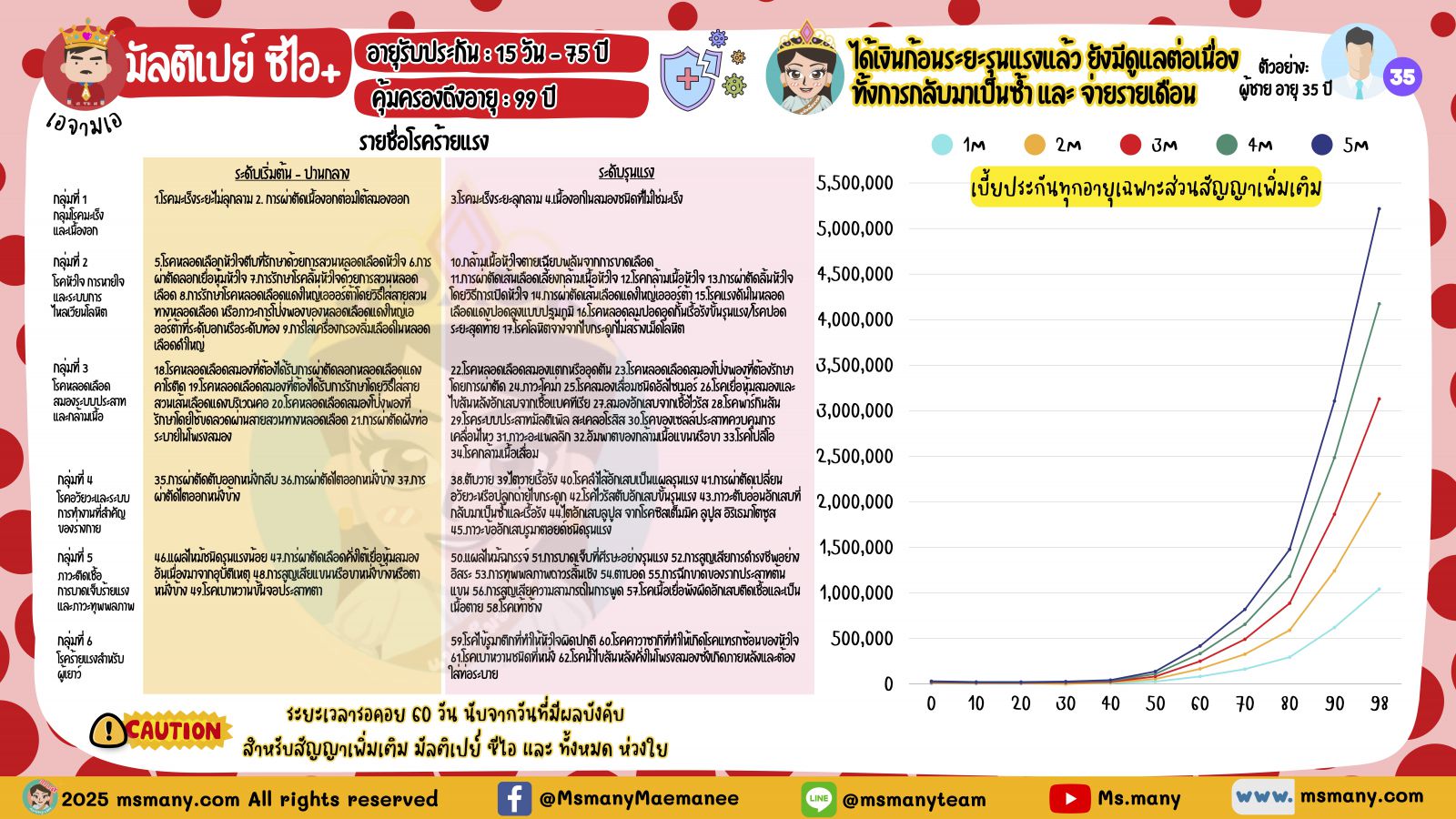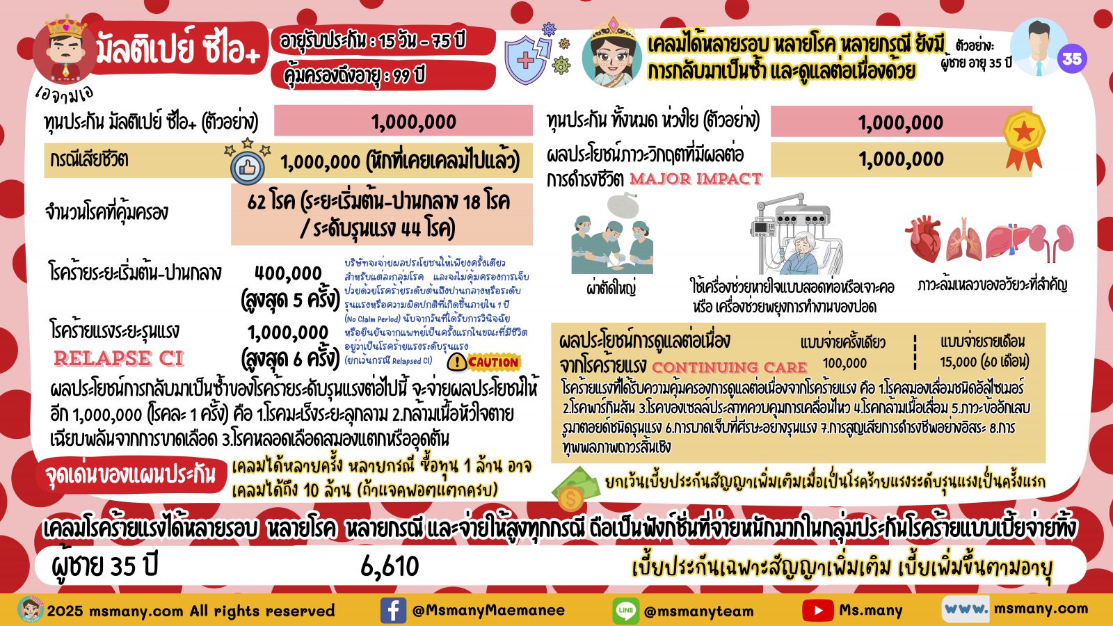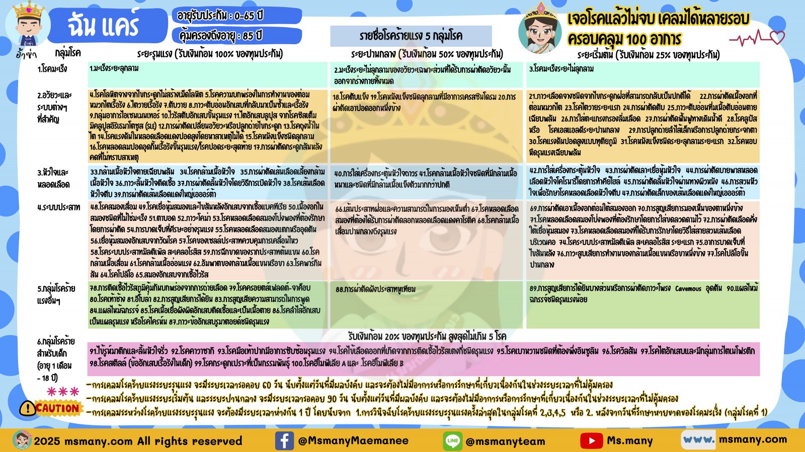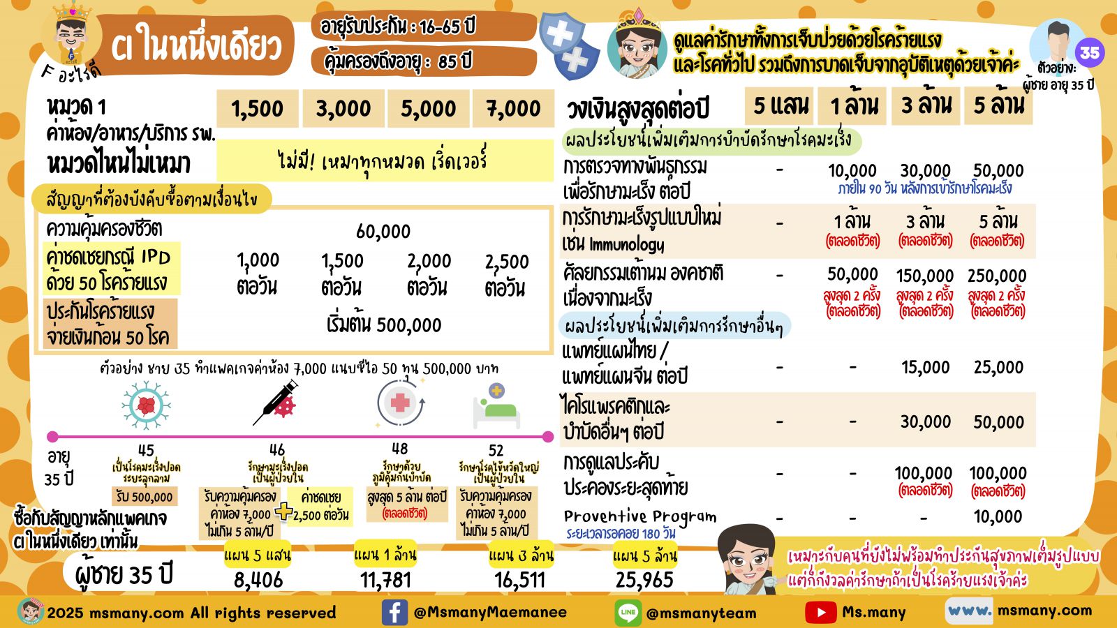 ดังนั้นแผนนี้เหมาะกับ “ทำเสริมประกันสุขภาพ” เจ้าค่ะ ไม่ใช่ทดแทนประกันสุขภาพ สำหรับใครที่ไม่มีประกันสุขภาพเลย แต่ตอนนี้ก็ยังไม่พร้อม จะขอทำเล็งแผนนี้ไปใช้แทนประกันสุขภาพ แม่มณีไม่แนะนำเท่าไหร่เจ้าค่ะ เพราะเรากะจะเป็นแค่ 2 โรคนี้เลยเหรอเจ้าคะ? ใครไม่มีประกันสุขภาพเลยแม่มณีแนะนำมงที่ 6 มงสุดท้ายเจ้าค่ะ