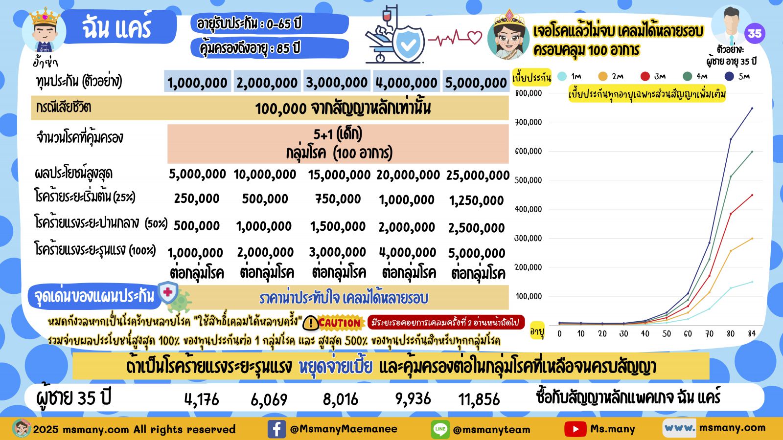 อย่างไรก็ดี ด้วยความที่มันมีฟังก์ชั่นการจ่ายใกล้เคียงกับประกันสุขภาพมาก ๆ เบี้ยประกันก็จะไม่ใช่หลักพันต้น ๆ เหมือนประกันโรคร้ายแรงตัวอื่น ๆ เจ้าค่ะ จะเริ่มที่เกือบหมื่น ไปจนถึงสองหมื่นห้าในแผน 5 ล้านต่อปี และกราฟเบี้ยประกันตอนแก่นี่ก็คือสูงลิ่วได้ไม่แพ้ประกันสุขภาพเช่นเดียวกัน ดังนั้นวันใดที่เราพร้อมขึ้นมาการทำประกันสุขภาพที่ไม่มีเงื่อนไขเกี่ยวพันอะไรกับโรคร้ายย่อมจะสบายใจกว่า และเบี้ยประกันก็แทบจะเท่ากันในวันที่แก่ตัวเจ้าค่ะ