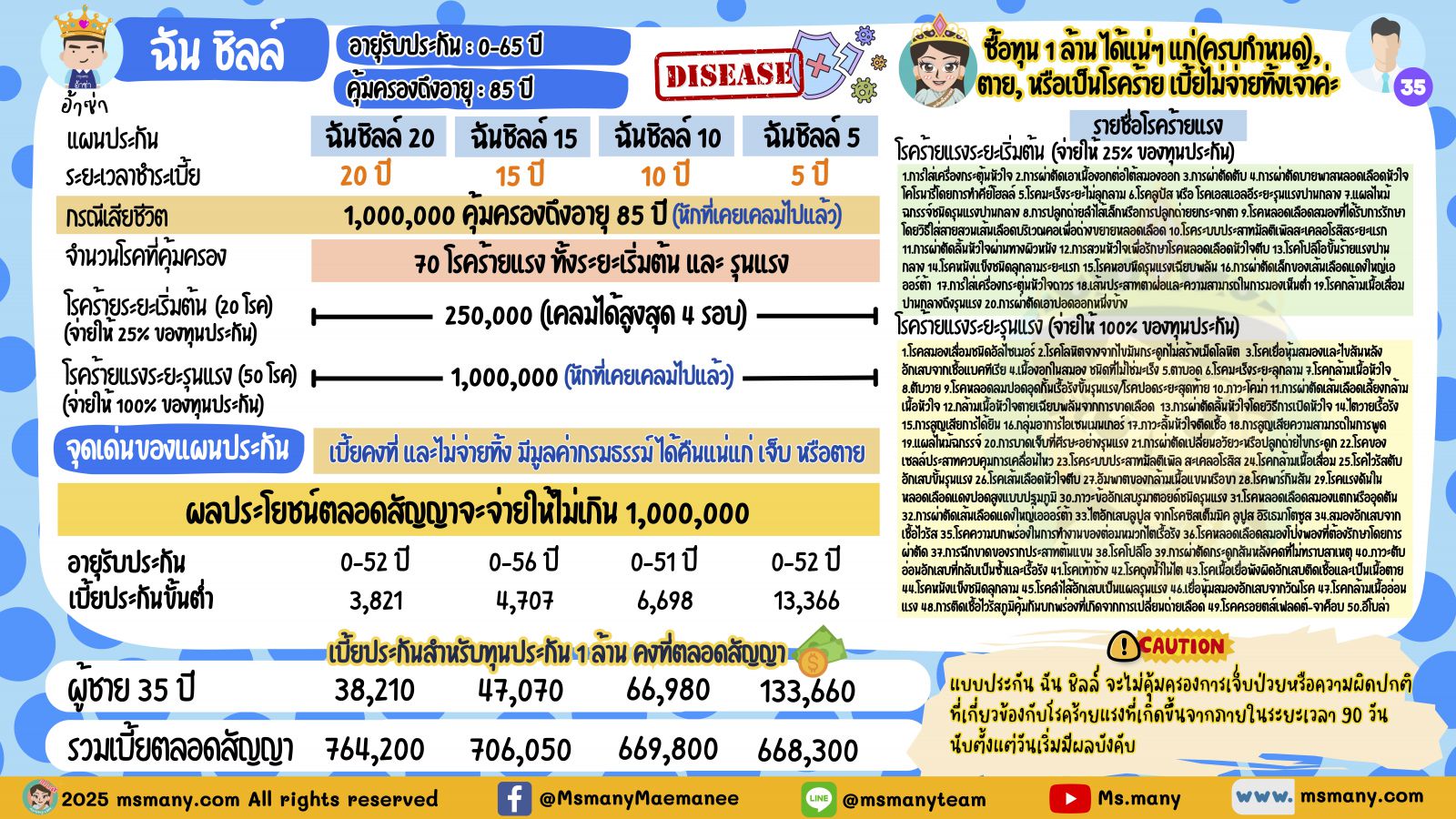 กลุ่มต่อไปสไตล์ “ชั่วชีวิต” เบี้ยประกันคงที่ ไม่จ่ายทิ้ง อันนี้แม่มณีมอบให้เป็นมงที่สี่ คือ ฉันชิลล์ ของป๊ะป๋า อ้าซ่าเจ้าค่ะ ด้วยจำนวนโรค ด้วยเงื่อนไข ด้วยราคา แม่มณีว่ามันโดดเด่น คุ้มค่า ยิ่งวัยทำงานฉันชิลล์ 20 ปี เบี้ยปีละ 38,210 ตกเก็บเงินวันละ 100 ติ๊ด ๆ มีวงเงินหนึ่งล้านไหลออกมาทันทีถ้ามีอันต้องเป็นโรคร้ายแรงตามลิสต์ ถ้าไม่เสียชีวิตแก่ตัวไปไม่มีความกังวลใจแล้วก็เวนคืนกรมธรรม์ออกมาได้ เงินหายน้อยมาก หรือถ้าอยากทิ้งให้เป็นมรดกคนข้างหลังก็ย่อมได้ จ่ายครบไปตั้งแต่ปีที่ 20 แล้ว การทำประกันโรคร้ายแรงในสไตล์นี้แม่มณีคิดว่ามันสอดคล้องกับไทม์ไลน์ชีวิต จ่ายเบี้ยให้จบในช่วงวัยทำงาน ความเสี่ยงคุ้มครองทั้งในช่วงวัยทำงานไปจนถึงวันใดก็ตามที่เราหมดความกังวลใจ โดยไม่มีภาระให้ต้องจ่ายเบี้ยหลังเกษียณ ติดอยู่ที่ว่าเบี้ยมันเป็นหลักหมื่น ถ้าข้ามประเด็นนี้ไปได้ แม่มณีสนับสนุนให้ทำสไตล์นี้เจ้าค่ะ