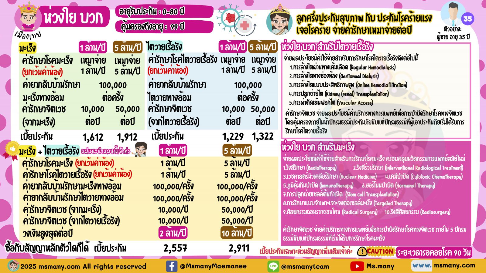 กลุ่มสุดท้ายสไตล์ “จ่ายค่ารักษา” นี่คือประกันสุขภาพฉบับที่เคลมได้ถ้าเป็นโรคร้ายแรงตามเงื่อนไขที่กำหนด มงที่ 5 เมืองเทย ห่วงใย บวก แผนประกันตัวนี้เหมือนออกแบบมาเคลมค่ารักษาโรคมะเร็ง และ ไตวาย เติมเต็มให้ใครที่อาจจะมีประกันสุขภาพอยู่แบบไม่เหมาจ่าย หรืออาจจะอยากเติมเทคโนโลยีการรักษาใหม่ ๆ ให้ประกันสุขภาพเล่มเดิม สำหรับ 2 โรคนี้โดยเฉพาะ (จริง ๆ จะซื้อเฉพาะมะเร็งก็ได้ แต่แม่มณีอยากให้ติดไตวายเข้าไปด้วยเถิดเจ้าค่ะ คนไทยไตไม่ค่อยได้พัก โซเดียมไทยไม่แพ้ชาติใดในโลก เบี้ยเพิ่มขึ้นไม่เยอะหรอกเจ้าค่ะ) ซึ่งจะจ่ายค่ารักษาโรคมะเร็ง และ ไตวายทั้งกรณีนอน และ ไม่นอน รพ. แบบเหมาจ่ายต่อปี มีให้เลือก 2 แผน คือ 1 ล้าน และ 5 ล้านต่อปี “ไม่มีค่าห้อง” เทคโนโลยีการรักษาเพียบ แม้แต่การรักษาด้านจิตเวชเครียดจากโรคร้ายก็ไปเคลมได้ แต่ขอย้ำอีกครั้งหนึ่งว่า “ไม่มีค่าห้อง”