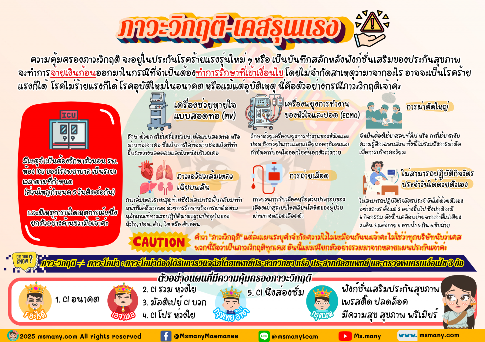 แม้คำนิยามของ “ภาวะวิกฤติ” แต่ละแผนประกันจะไม่ได้เหมือนกันซะทั้งหมด แต่พอจะหยิบยกหลักการได้คร่าว ๆ ว่ามักจะเกี่ยวข้องกับ “การนอนห้อง ICU” ต่อเนื่องตามจำนวนวันที่กำหนด เท่าที่เห็นมักจะเป็นการนอนห้อง ICU ติดต่อกัน 5 วันขึ้นไป และจะต้องมีการรักษาอย่างใดอย่างหนึ่ง เช่น มีการใช้เครื่องช่วยหายใจแบบสอดท่อ, มีการใช้เครื่อง ECMO, มีการผ่าตัดแบบวางยาสลบทั่วไป, มีการปฏิบัติกิจวัตรประจำวันไม่ได้ หรืออื่น ๆ อีกมากมายแล้วแต่เงื่อนไขของแบบประกันจะกำหนดไว้ แต่ละค่าย แต่ละแผน นับคำว่าวิกฤติไม่ได้เหมือนกันทั้งหมด แต่เท่าที่แม่มณีเห็น 2 เคสที่ทุกค่ายเห็นพ้องต้องกันว่าวิกฤติแน่ ก็คือ การใช้เครื่องช่วยหายใจแบบสอดท่อ (MV) และ การใช้เครื่องช่วยพยุงการทำงานของหัวใจและปอด (ECMO) เจ้าค่ะ