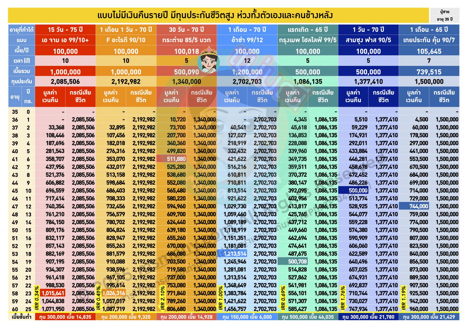 หน้าแรกเป็นแบบที่ไม่มีเงินคืนรายปี ไม่ต้องการเงินตอนนี้ต้องการเก็บลืมไว้ในกรมธรรม์ วันไหนอยากได้เงินก้อนก็เวนคืนได้มูลค่าเวนคืนตามตารางมูลค่ากรมธรรม์ในแต่ละปี Easy เลือกปีที่ครบกำหนดเอาเองตามใจชอบ กลุ่มนี้นี่แหล่ะที่แม่มณีโปรดปรานที่สุด เพราะเมื่อไม่มีเงินคืนรายปี ทั้งทุนประกันชีวิต และ มูลค่าเวนคืนจะสูงกว่าโดยเปรียบเทียบ เหยื่อการตลาดอย่างแม่มณีไม่มีวินัยมากเพียงพอที่จะเอาเงินคืนรายปีนั้นมาลงทุน หรือออมต่อ มีแนวโน้มว่าจะนำไปจับจ่ายใช้สอยมากกว่า จริตแม่มณีจึงเหมาะกับสัญญาที่ไม่จ่ายเงินคืนรายปีเจ้าค่ะ