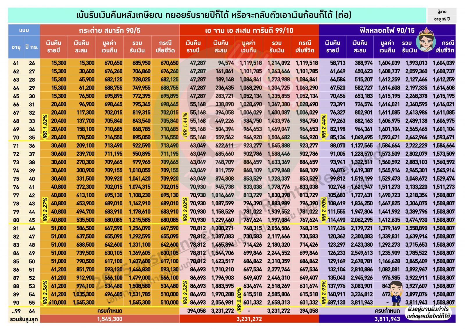 และกลุ่มสุดท้ายแม่มณีตั้งชื่อเล่นให้ว่า “บำนาญที่กลับตัวได้” ใครที่ชอบ concept ของประกันบำนาญ แต่ติดใจที่ว่าหลังรับบำนาญไปแล้วก็คือต้องรับบำนาญไปตลอด จะเปลี่ยนใจมารับเป็นเงินก้อนไม่ได้อีกแล้ว แน่นอนบำนาญรายปีได้รับเยอะกว่า แต่ว่าฉันอาจจะอยากได้เงินก้อนตอนอายุ 70 ก็ได้นะ แม่มณีจะแนะนำให้รู้จักกับหน้านี้เจ้าค่ะ เป็นประกันตลอดชีพเนี่ยแหล่ะที่จ่ายเงินคืนน้อยมากในช่วงแรก ๆ แต่จะไปจ่ายเยอะ จ่ายดุดัน ไม่เกรงใจใครเอาในช่วงปีท้ายหลังเกษียณ แน่นอนว่าโดยอัตราแล้วคงจ่ายรายปีเยอะไม่เท่าประกันบำนาญหรอกเจ้าค่ะ แต่ว่าถ้าวันใดคุณไม่อยากทยอยได้บำนาญแบบรายปี อยากจะปิดบัญชีเวนคืนเอาเงินก้อนออกมาใช้คุณก็ทำได้ทุกเวลา แถมเสียชีวิตก็ยังมีมรดกด้วยหนา ในขณะที่ประกันบำนาญถ้าตายหลังช่วงเวลาการันตีบำนาญแล้วจะไม่มีอะไรให้ผู้รับประโยชน์เลย สำหรับหน้านี้แม่มณีมอบมงให้ฟิลหลอดไฟเจ้าค่ะ 90/15 รุ่นนี้ปีลึกแม่มณีเห็นมาตั้งแต่เข้าวงการประกันใหม่ ๆ อยู่เงียบ ๆ มานานมากแล้ว ไม่ค่อยมีคนพูดถึง แม่มณีก็มอบมงให้ทุกปี มันดีมากจริง ๆ นะเจ้าคะ ข้อจำกัดคือทำได้สำหรับคนอายุไม่เกิน 45 เท่านั้นเจ้าค่ะ